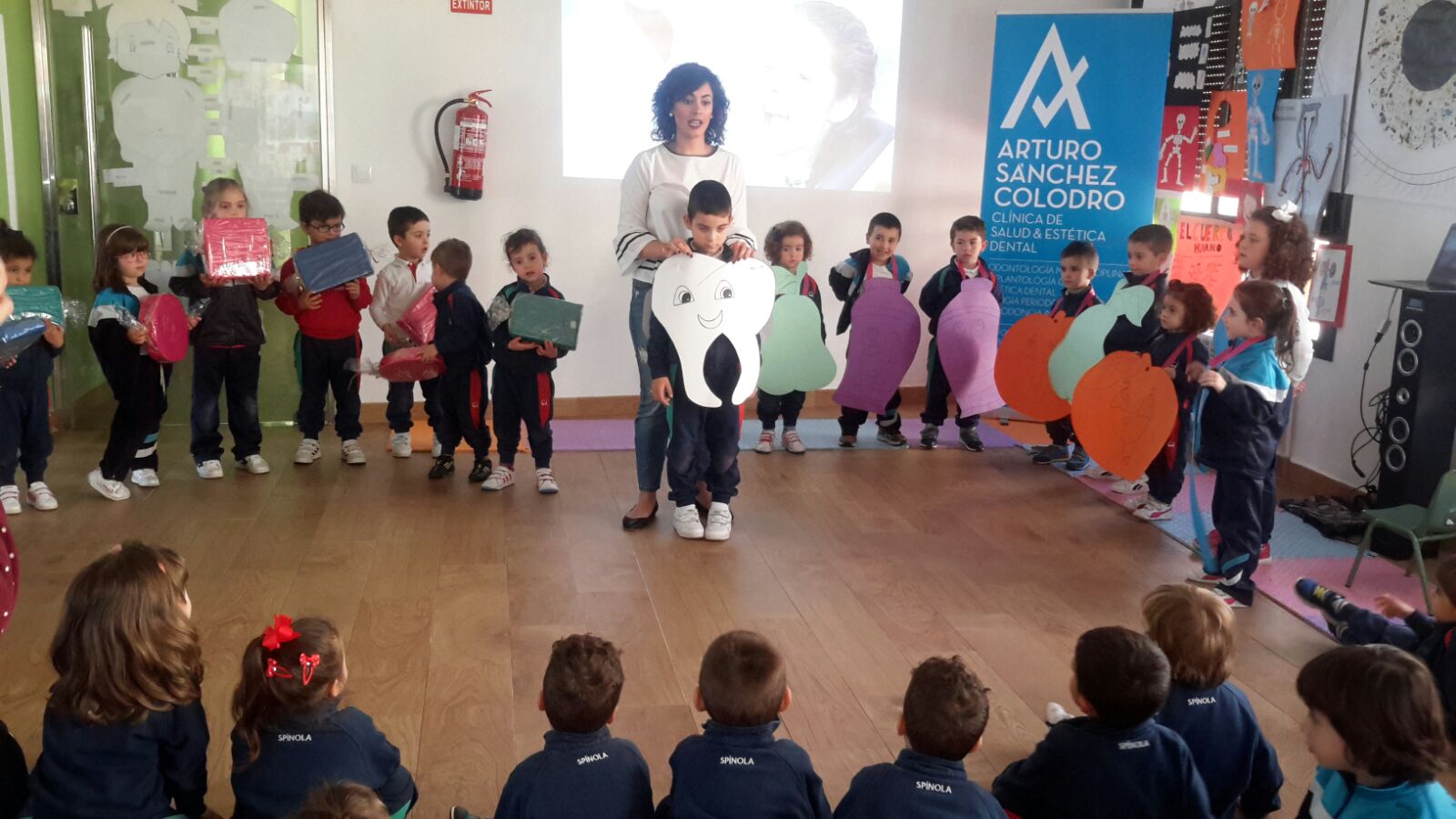 Hoy, los niños del colegio Marcelo Spínola de Jaén han recibido la visita de una de las higienistas de nuestra clínica dental, Pilar de la Torre. Están estudiando las distintas partes que componen el cuerpo humano y ha sido un buen momento para explicarles todo sobre nuestros dientes, su cuidado y su limpieza.