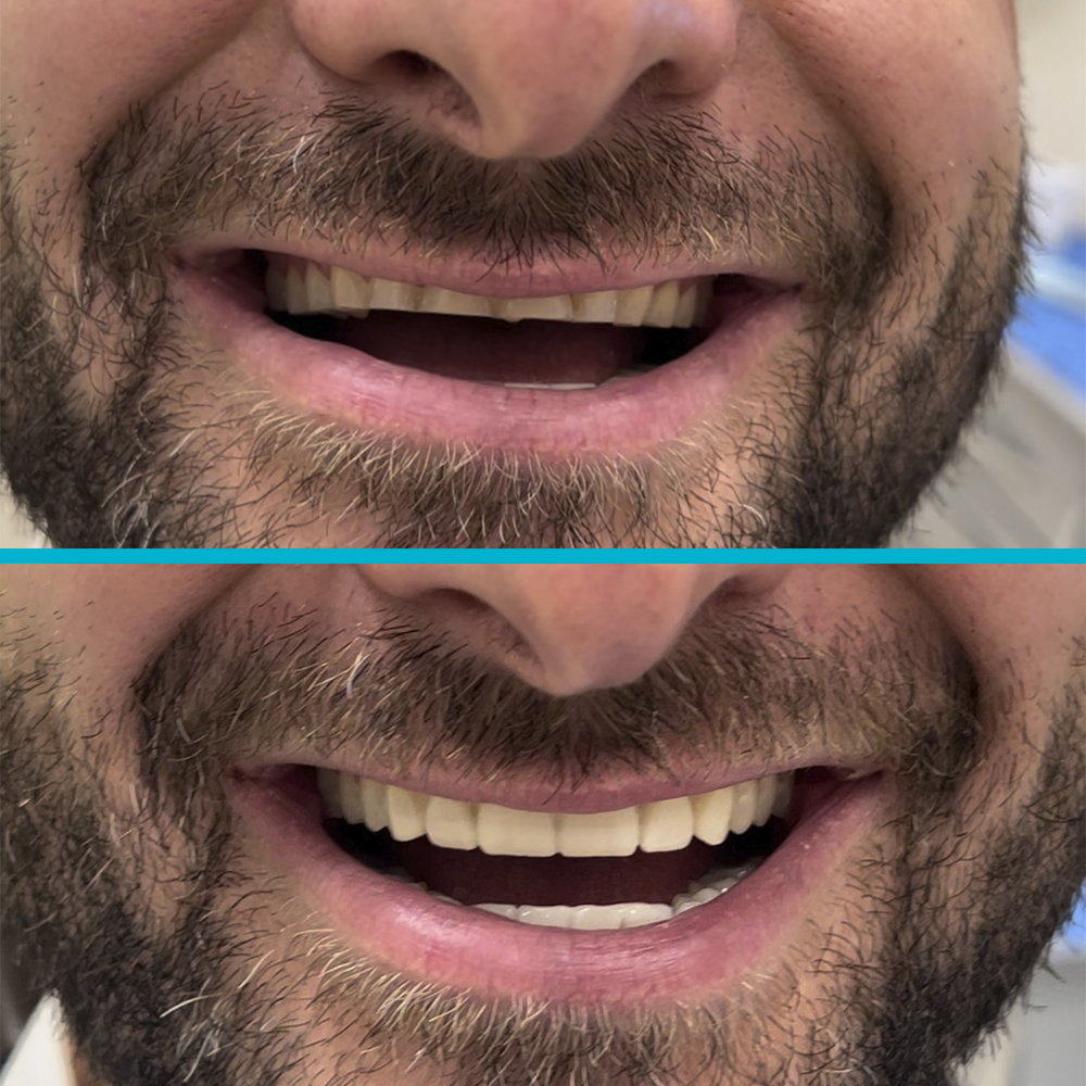- Preparación de los dientes: Administramos anestesia local y preparamos los dientes remanentes en ambas arcadas para recibir las prótesis fijas. Esto puede incluir la reducción del tamaño de los dientes y la creación de una forma adecuada para las coronas provisionales y definitivas.
