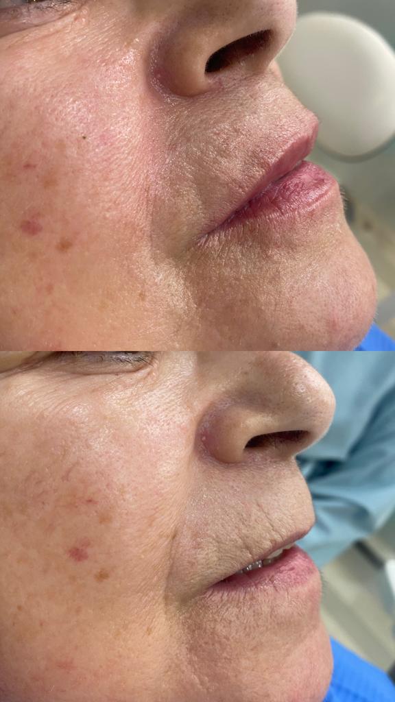 El Resultado: Después del tratamiento de rejuvenecimiento del tercio inferior con ácido hialurónico, nuestras pacientes experimentaron una transformación asombrosa. Las líneas de marioneta se suavizaron, los pliegues nasolabiales se redujeron significativamente y el contorno de la mandíbula se mejoró. El resultado fue una apariencia más joven, fresca y natural que dejó al paciente encantado.
