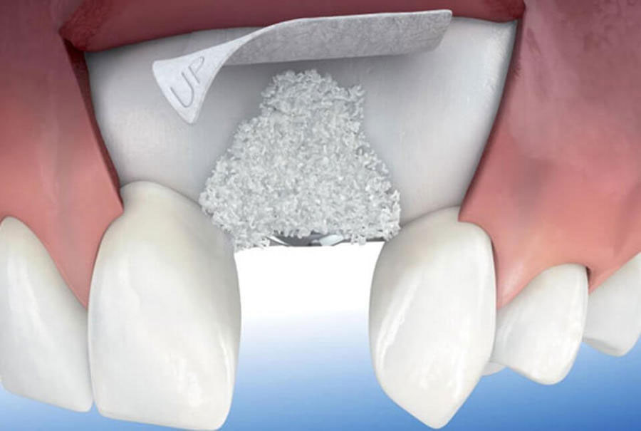 - Estabilización con membrana de colágeno: Para proteger el área y promover la regeneración ósea, se recubre la mezcla de hueso autólogo y Bio-Oss con una membrana de colágeno. La membrana ayuda a mantener el material de injerto en su lugar y actua como barrera para las células epiteliales no deseadas.