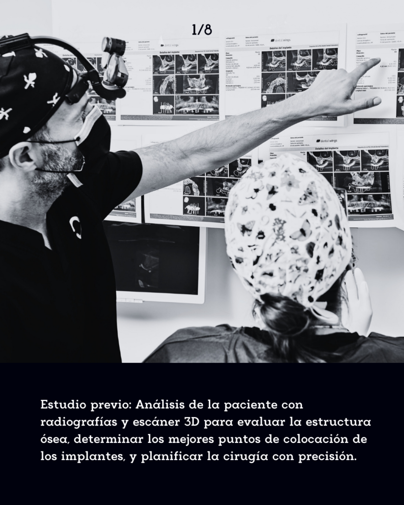 Hoy queremos compartir un caso clínico impresionante: la rehabilitación completa de la arcada superior de Isabel en un solo día. Este procedimiento incluyó la colocación de 8 implantes fijos y la entrega de unas prótesis definitivas, todo con la tecnología más avanzada.