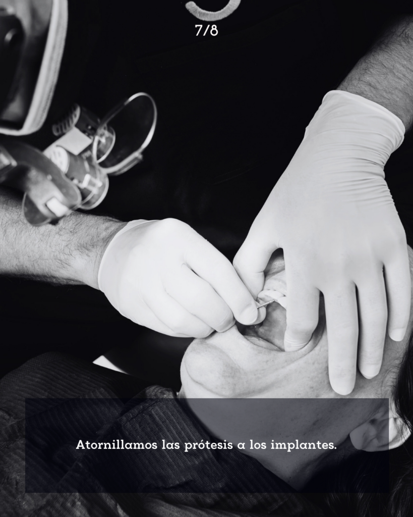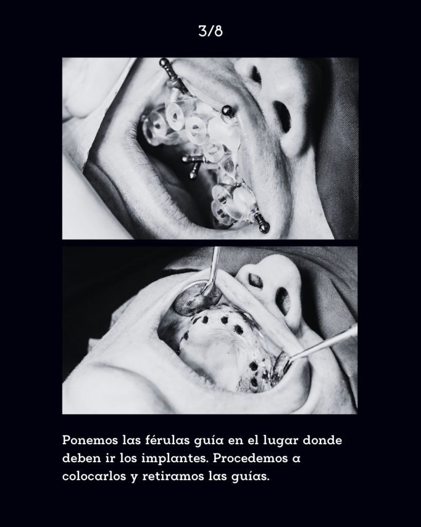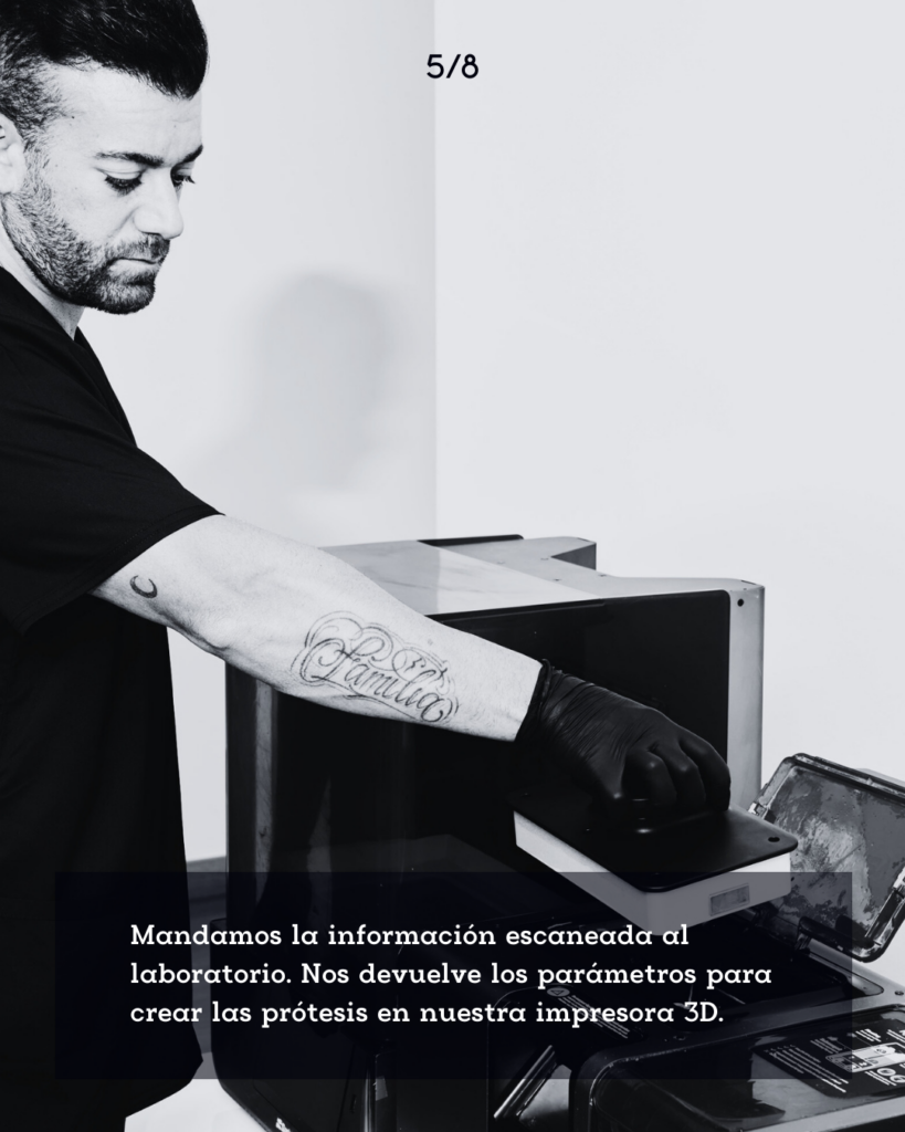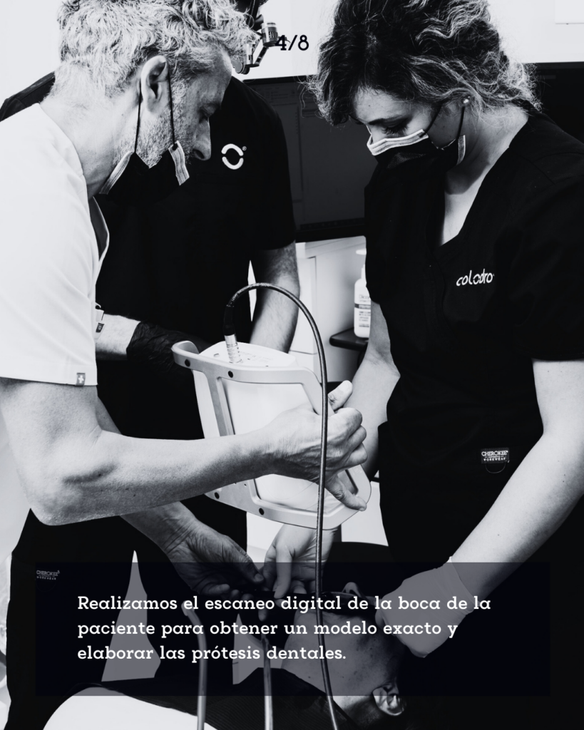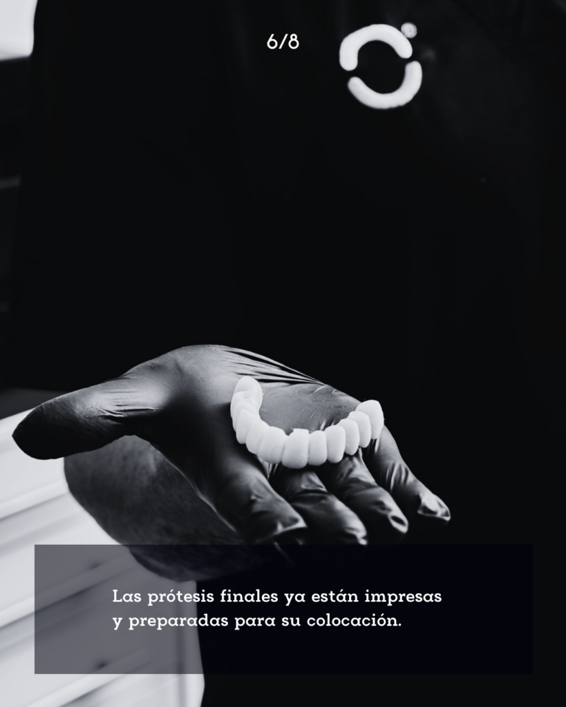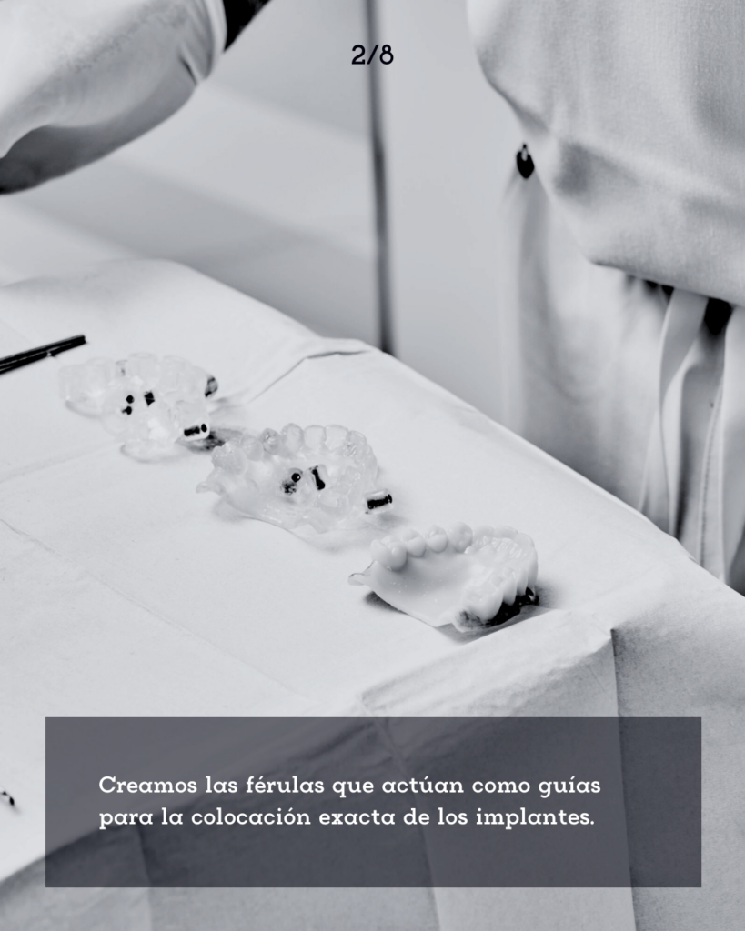 Tras un estudio previo con el escáner 3D, diseñamos guías quirúrgicas que nos permitieron colocar los implantes con precisión milimétrica. Posteriormente, realizamos un escaneo digital para elaborar las prótesis personalizadas, que imprimimos en nuestra clínica y atornillamos a los implantes el mismo día.