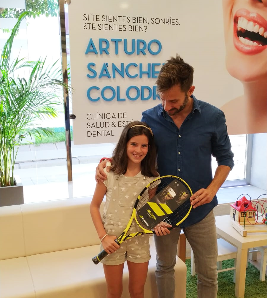 En la tarde de ayer, el Dr. Arturo Sánchez Colodro le hizo entrega de la raqueta Babolat. Le hizo mucha ilusión, pues la pequeña juega al tenis, recibe clases y participa en torneos. ¡Buen uso va a darle sin duda! ¡Enhorabuena!